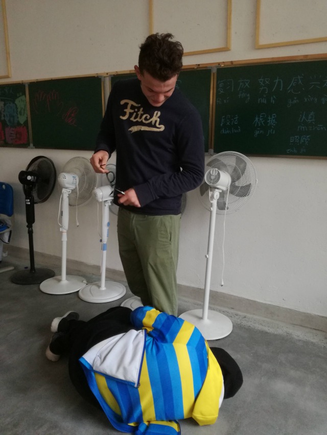 Il pomeriggio ognuno va in una classe cinese. io sono in una classe di 50 studenti! Sono nell'ultima fila e qui succedono molte cose "interessanti”: tutti sostengono che i Cinesi amino la scuola e che stiano tutti zitti e muti ansiosi di apprendere cose nuove, ma se provate l'ultimo banco, vi accorgerete che non è proprio così. Per iniziare in generale metà classe dorme, anche se dove sono io, tutti parlano e usano il telefono. Ma il mio compagno di banco li batte tutti: lui riesce a FUMARE durante le lezioni! Adesso vi chiederete "come fanno i professori a non accorgersene?"; credetemi che con 50 persone che respirano in mezzo e con la finestra di lato aperta, nessuno ci fa caso.
