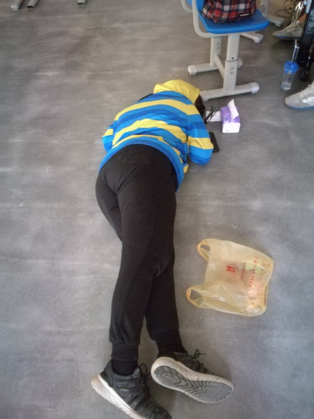 Noi in teoria dovremmo cominciare scuola alle 8, mentre gli studenti cinesi devono essere a scuola alle 7 e cominciano le lezioni alle 7:25. Nella mia scuola le lezioni durano 50 minuti e dopo si ha una pausa di 10 minuti, durante la quale la maggior parte degli studenti dorme.