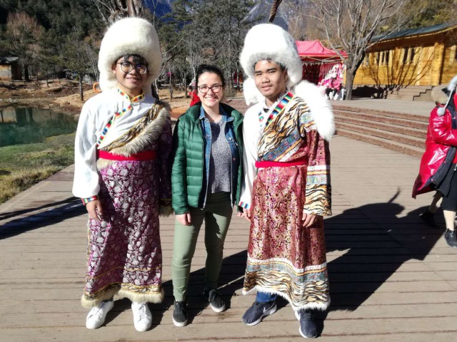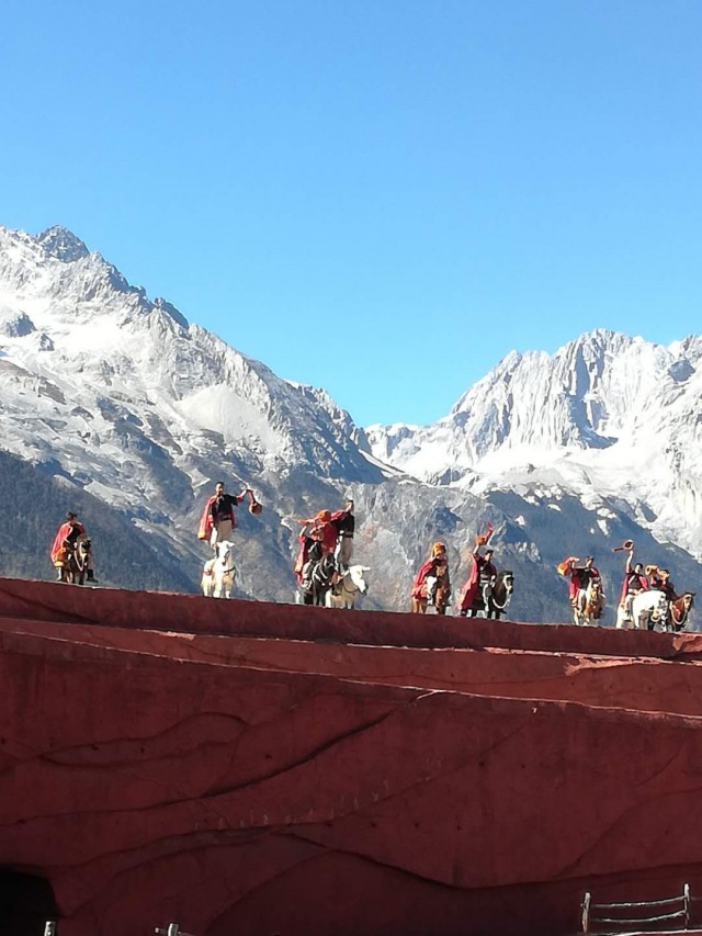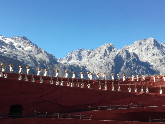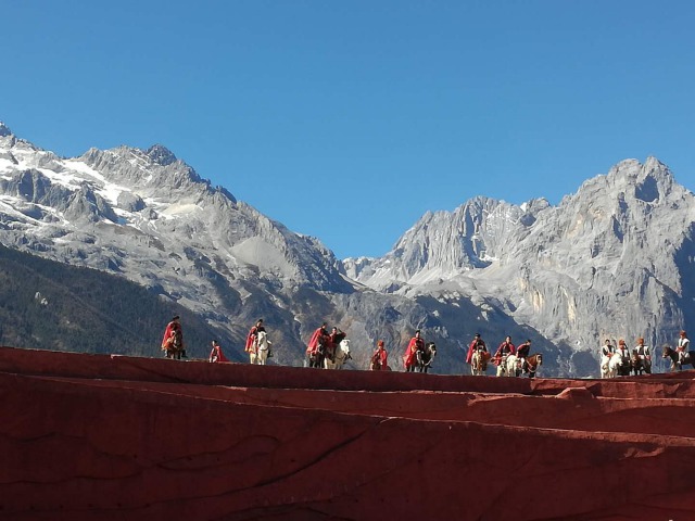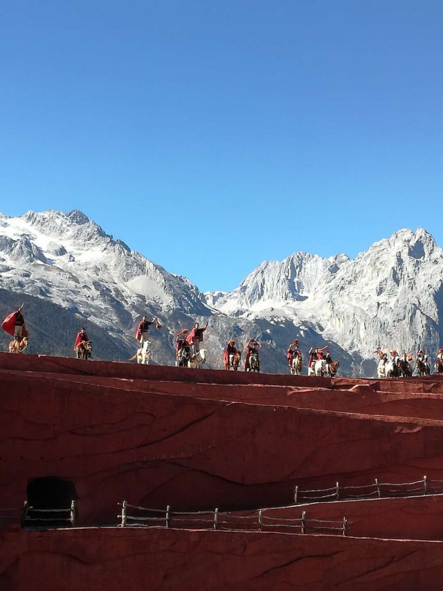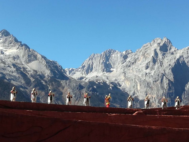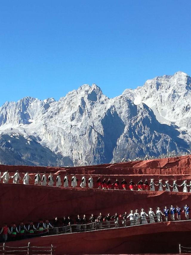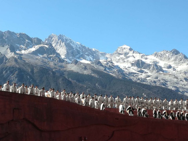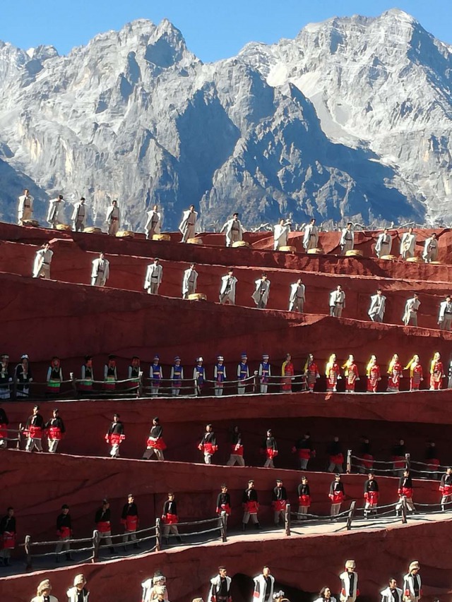 Ad ora di pranzo e siamo andati a mangiare in un ristorante con vista sulle montagne. Abbiamo mangiato riso, delle polpette e le tipiche patatine nuvole di drago. Dopo aver mangiato siamo andati a vedere uno spettacolo intitolato "Lijiang impression", durato circa un'ora. È un magnifico spettacolo di danza e musica che si tiene in un teatro all’aperto, ai piedi delle montagne. Nello "Jade snow mountain" le persone del posto si esibiscono mostrando il loro stile di vita e le loro tradizioni. È una creazione del direttore Cinese Zhang Yimou. Ci sono oltre 500 persone ad esibirsi in vestiti tradizionali appartenenti a diverse minoranze etniche: ci sono ad esempio i Naxi, i Bai e gli Yi. Si esibiscono in canti, musica con i tamburi e spettacoli con i cavalli. La temperatura per fortuna si è alzata ed in cielo non c'è una nuvola, quindi lo spettacolo ce lo siamo goduti fino in fondo. Sono riuscita perfino ustionarmi.